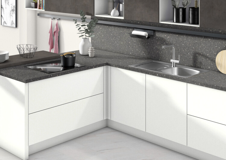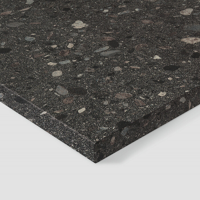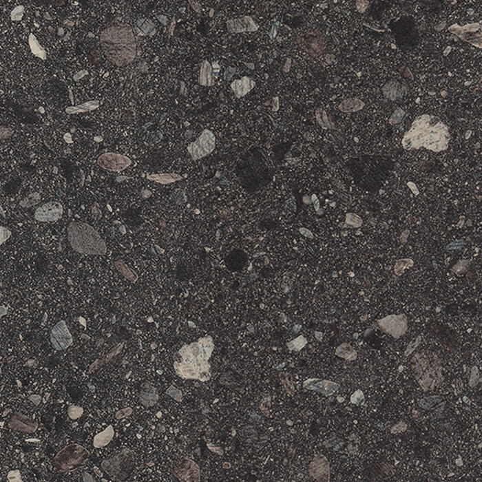 В соответствии с тенденцией к использованию имитаций терраццо была создана выразительная репродукция камня Камень Вентура чёрный. Модными являются комбинации с чёрными однотонными или древесными декорами. Со светлыми классическими древесными репродукциями декор столешниц создаёт современный контраст. Благодаря разноцветным камням в рисунке декора он особенно хорошо гармонирует также с пастельными цветами разных оттенков. Структура ST76 Минерал шероховатый матовый придаёт декору рельефность, на ощупь напоминающую шероховатую поверхность камня.