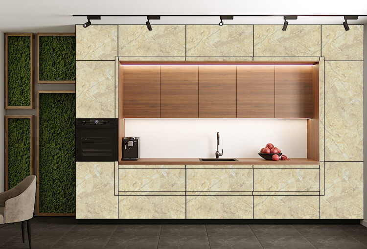 Пластик - это декоративный материал для отделки мебели, являет собой бумажно-слоистый пластик. Современное решение для декоративной отделки кухонь, производится специальным методом прессования некоторых видов бумаги, которые перед началом производства пропитывают синтетическими смолами. Материал обладает широкой цветовой гаммой. Один оттенок можно использовать в нескольких фактурах, таких как матовый, структурный или глянцевый. Если выбрана древесная структура, которая более подходящая для изготовления классических кухонных гарнитуров есть варианты с матовым и глянцевым покрытием. Можно создать покрытие с имитацией смятой бумаги, камня, тканевой фактуры, с разными рисунками, абстрактными в том числе.