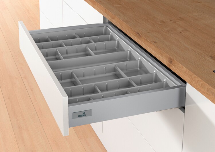 Для стандартной ширины корпуса Пластик, цвет серебристый Состав комплекта: 1 пластиковый лоток для столовых приборов Разделители для индивидуального деления ящика (количество зависит от ширины)