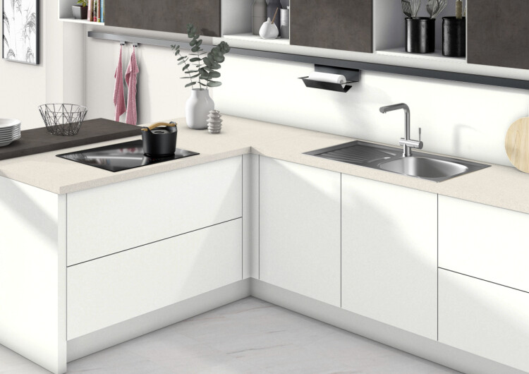 Декор Камень Сонора белый представляет собой имитацию камня терраццо нейтрального оттенка, подходящего ко всем древесным и однотонным декорам. К тому же он является идеальным декором для столешниц, предоставляя возможность оформления рабочих поверхностей, подвергающихся интенсивным нагрузкам, в очень светлых тонах. Структура ST15 Мягкий вельвет имеет также нейтральный внешний вид и не требует особого ухода.