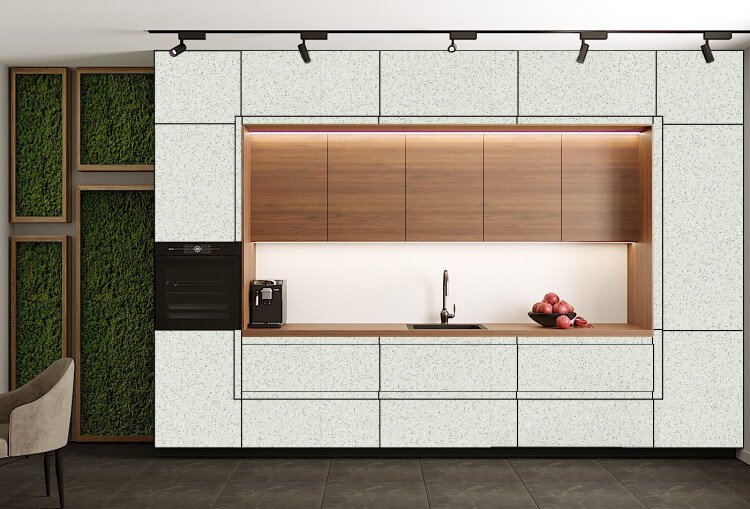 Пластик - это декоративный материал для отделки мебели, являет собой бумажно-слоистый пластик. Современное решение для декоративной отделки кухонь, производится специальным методом прессования некоторых видов бумаги, которые перед началом производства пропитывают синтетическими смолами. Материал обладает широкой цветовой гаммой. Один оттенок можно использовать в нескольких фактурах, таких как матовый, структурный или глянцевый. Если выбрана древесная структура, которая более подходящая для изготовления классических кухонных гарнитуров есть варианты с матовым и глянцевым покрытием. Можно создать покрытие с имитацией смятой бумаги, камня, тканевой фактуры, с разными рисунками, абстрактными в том числе.