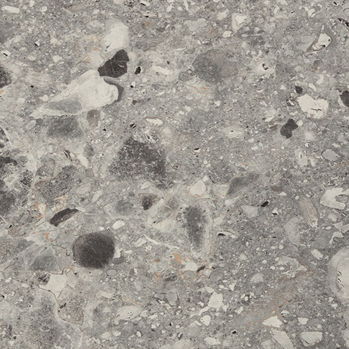 Имитации терраццо в качестве ретро-элементов снова используются в дизайне интерьеров. Терраццо Триест серый – это выразительный декор с несколько б?льшим масштабом рисунка, который за счёт своих серых оттенков очень хорошо подходит к поверхностям как в актуальных серых однотонных декорах, так и к древесным репродукциям, таким как Орех или светлый Каштан. Структура ST75 Минеральный сатин придаёт декору на ощупь бархатистость, а на вид естественную неравномерность рельефа.