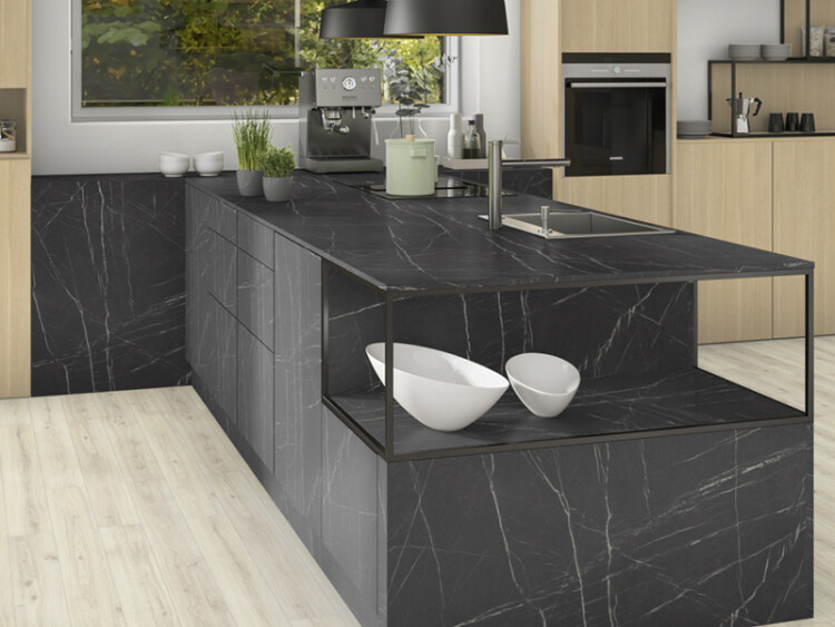 Мрамор популярен не только в белом варианте. Декор Камень Пьетра Гриджиа чёрный имеет выразительный рисунок, позволяющий в особенности за счёт своих белых прожилок создавать чёрно-белые комбинации с белыми декорами во всех структурах или с древесными декорами белых оттенков. В комбинации возможно также создавать яркие цветовые акценты, например с оттенками красного. Эта репродукция мрамора смотрится очень аутентично даже на больших площадях, так как увеличенный раппорт в формате XL редко повторяет рисунок. Структура ST9 Мягкий матовый придаёт поверхности декора соответствующую прохладность и матовость на ощупь. Декор с определенным направлением рисунка.