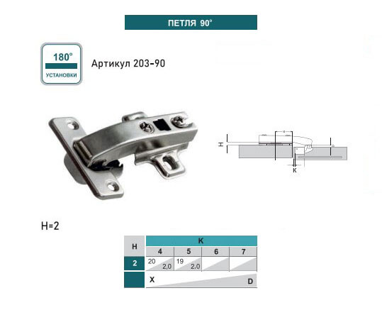 Петля 90° Покрытие - антикоррозийное никелирование. Угол открытия: 95°. Глубина чашки: 11.5 мм. Диаметр чашки: 35 мм. Межосевое расстояние чашки: 48 мм. К: 3-7 мм. Толщина двери: 14-23 мм.