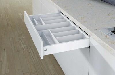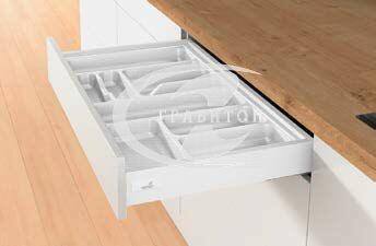 Для стандартной ширины корпуса Пластик, цвет белый Состав комплекта: 1 пластиковый лоток для столовых приборов Разделители для индивидуального деления ящика (количество зависит от ширины)