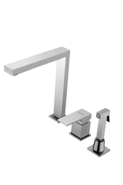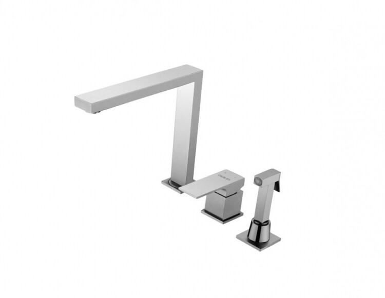 Смеситель для кухни в мойку OL-CS9622K. Данный кухонный смеситель с поворотным изливом, выносным душем и рычагом включения / выключения воды. Выносной душ - выдвижной, что позволит помыть труднодоступные места или крупные овощи / фрукты. Смеситель имеет отдельную ручку для регулировки подачи потока воды. Дизайн смесителя сделан в стиле хай-тек. Длина 266 мм позволит удобно мыть большие кастрюли. Может монтироваться в мойку или столешницу. В комплекте идет: ключ для монтажа, 4 гибких и 1 жесткая подводка и утяжелитель для выносного душа.