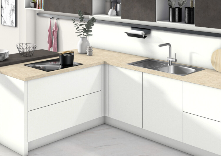 Мрамор Латина считается классическим базовым декором для столешниц. Бежево-коричневый оттенок хорошо подходит к классическим репродукциям дуба и бука, но также, образуя светлый контраст, сочетается с имитацией дуба черно-коричневого оттенка.