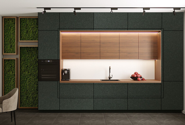 Пластик - это декоративный материал для отделки мебели, являет собой бумажно-слоистый пластик. Современное решение для декоративной отделки кухонь, производится специальным методом прессования некоторых видов бумаги, которые перед началом производства пропитывают синтетическими смолами. Материал обладает широкой цветовой гаммой. Один оттенок можно использовать в нескольких фактурах, таких как матовый, структурный или глянцевый. Если выбрана древесная структура, которая более подходящая для изготовления классических кухонных гарнитуров есть варианты с матовым и глянцевым покрытием. Можно создать покрытие с имитацией смятой бумаги, камня, тканевой фактуры, с разными рисунками, абстрактными в том числе.