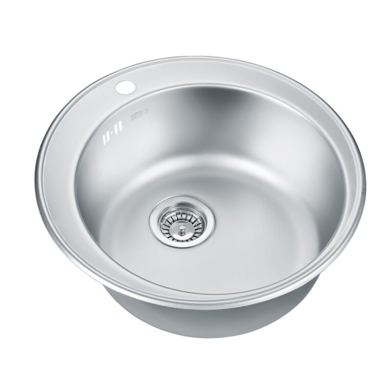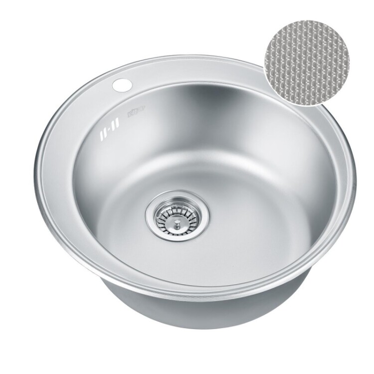 EMAR 510С декор: необычная кухонная мойка из нержавеющей стали. Поверхность мойки декорирована (рельефная поверхность). Вес кухонной мойки 3.06 кг. Поверхность данной модели мойки бывает: глянец / декор / электролиз. Данная мойка идеально впишется в малогабаритную кухню. Основные характеристики мойки: - Вырез под мойку, мм от 490 мм- Диаметр мойки d 410 мм- Габаритные размеры мойки: диаметр (d) 510 мм- Размеры чаши: диаметр и глубина (d) 410 х 180 мм