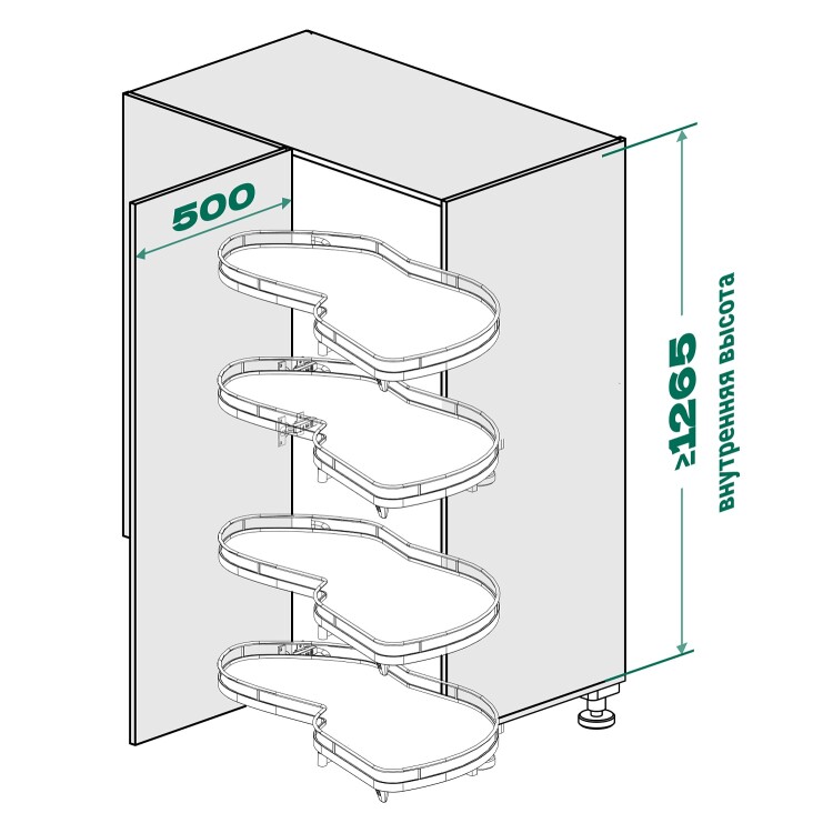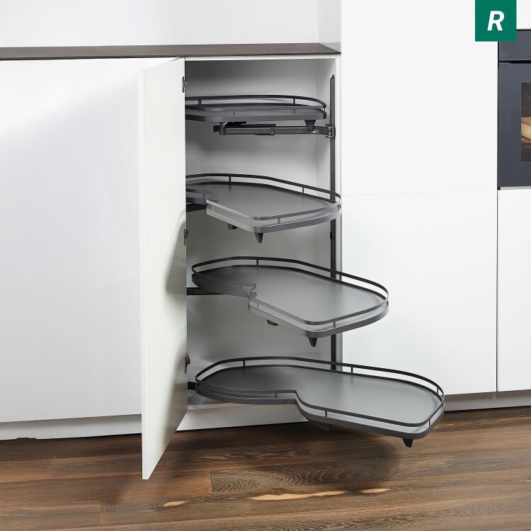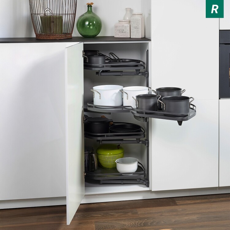 Леманс - идеальный поворотно-выдвижной механизм для прямых угловых тумб! Удобство и лёгкость в работе поражает - каждая полка полностью выезжает из тумбы, обеспечивая полный и беспрепятственный доступ к содержимому. Ручки соседних шкафов не затрудняют открывания, ведь траектория движения механизма позволяет открывать фасад всего на 85 градусов. Каждая полка позволяет выдержать нагрузку в 25кг, а благодаря регулировке высоты, любая высокая кастрюля находит свое оптимальное пространство для хранения и всегда остается в прямом доступе.