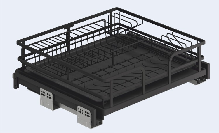 Выдвижная корзина-сушка выполнена в стильном графитовом цвете, который придает ей современный и лаконичный вид. Этот нейтральный оттенок легко сочетается с различными цветовыми решениями кухонной мебели. Металлические прутья обеспечивают отличную циркуляцию воздуха, что способствует быстрому и эффективному высыханию посуды.