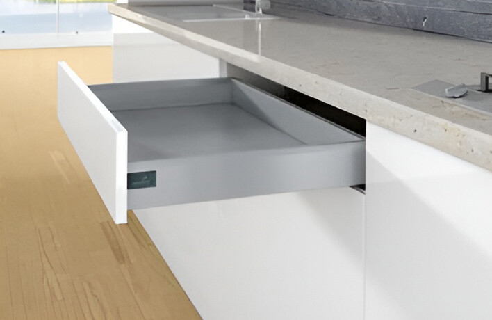 Набор фурнитуры без направляющих HETTICH, для ящика ArciTech, фасадный, NL400, H94, цвет серебристый, под пресс, (V1) Состав комплекта: • 2 боковины, левая и правая • 2 соединителя передней панели, под запрессовку • 2 заглушки с логотипом Hettich, пластик, цвет антрацит • 2 соединителя задней стенки, левый и правый • Крепеж