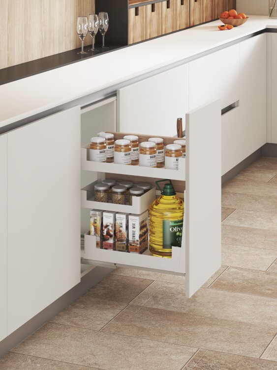 Одним из самых рациональных способов организовать систему хранения на современной кухне является установка в мебели выдвижных корзин. Сегодня такой вариант хранения очень популярен, поскольку оптимизирует расположение посуды и прочей кухонной утвари и облегчает доступ к пространству в угловых корпусах мебели. Выдвижные корзины для кухни могут иметь несколько уровней, устанавливаются на направляющие полного выдвижения — иными словами, выдвигаются на всю допустимую конструкцией глубину изделия, что позволяет использовать все внутреннее пространство корзины и обеспечить доступ к нему.