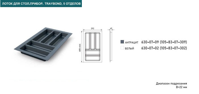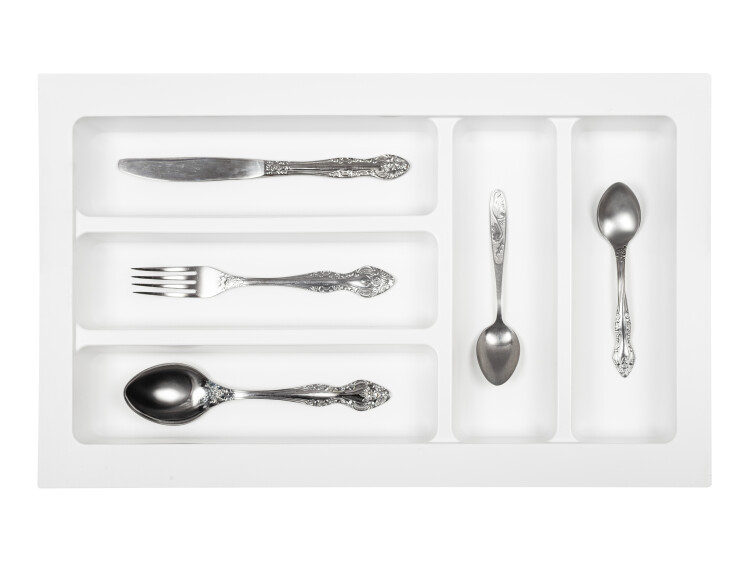 Лоток для хранения столовых приборов TRAYBOND с пятью отделами белого цвета от производителя Gelony. Сделан из прочного пластика, не выцветает со временем. Лоток имеет удобную форму и размер, что позволяет вместить набор ложек, вилок, ножей, штопор, палочки для еды и т.д.