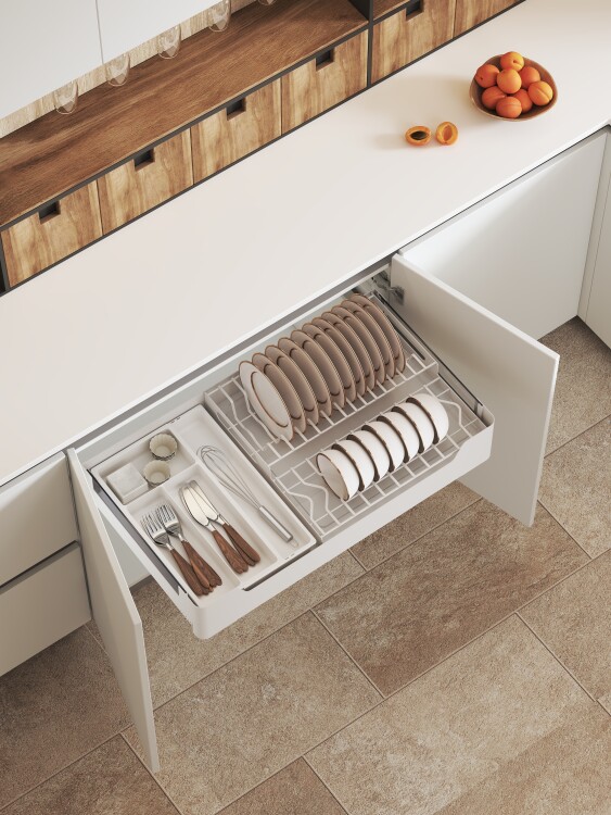 Одним из самых рациональных способов организовать систему хранения на современной кухне является установка в мебели выдвижных корзин. Сегодня такой вариант хранения очень популярен, поскольку оптимизирует расположение посуды и прочей кухонной утвари и облегчает доступ к пространству в угловых корпусах мебели. Выдвижные корзины для кухни могут иметь несколько уровней, устанавливаются на направляющие полного выдвижения — иными словами, выдвигаются на всю допустимую конструкцией глубину изделия, что позволяет использовать все внутреннее пространство корзины и обеспечить доступ к нему.