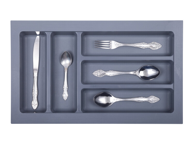 Лоток для хранения столовых приборов TRAYBOND с пятью отделами цвета антрацит от производителя Gelony. Сделан из прочного пластика, не выцветает со временем. Лоток имеет удобную форму и размер, что позволяет вместить набор ложек, вилок, ножей, штопор, палочки для еды и т.д.