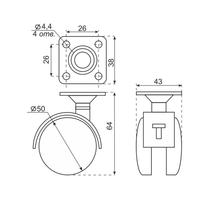 Колесо мебельное черное, 50 мм, с тормозом, с площадкой (Gelony) (200шт/кор)