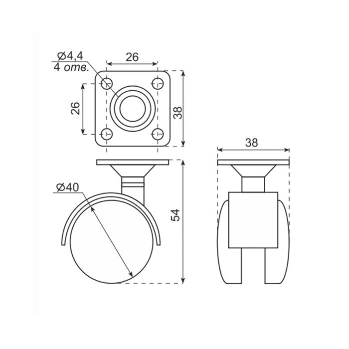 Колесо мебельное черное, 40 мм, без тормоза, с площадкой (Gelony) (200шт в кор)