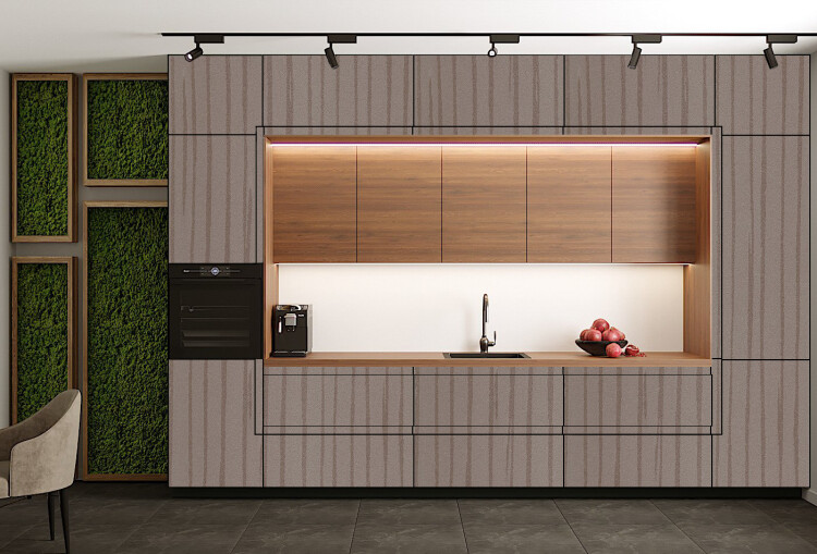 Пластик - это декоративный материал для отделки мебели, являет собой бумажно-слоистый пластик. Современное решение для декоративной отделки кухонь, производится специальным методом прессования некоторых видов бумаги, которые перед началом производства пропитывают синтетическими смолами. Материал обладает широкой цветовой гаммой. Один оттенок можно использовать в нескольких фактурах, таких как матовый, структурный или глянцевый. Если выбрана древесная структура, которая более подходящая для изготовления классических кухонных гарнитуров есть варианты с матовым и глянцевым покрытием. Можно создать покрытие с имитацией смятой бумаги, камня, тканевой фактуры, с разными рисунками, абстрактными в том числе.