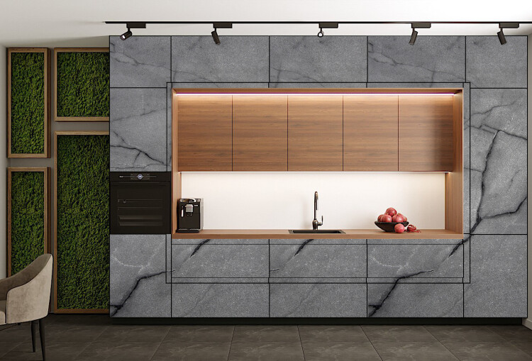 Пластик - это декоративный материал для отделки мебели, являет собой бумажно-слоистый пластик. Современное решение для декоративной отделки кухонь, производится специальным методом прессования некоторых видов бумаги, которые перед началом производства пропитывают синтетическими смолами. Материал обладает широкой цветовой гаммой. Один оттенок можно использовать в нескольких фактурах, таких как матовый, структурный или глянцевый. Если выбрана древесная структура, которая более подходящая для изготовления классических кухонных гарнитуров есть варианты с матовым и глянцевым покрытием. Можно создать покрытие с имитацией смятой бумаги, камня, тканевой фактуры, с разными рисунками, абстрактными в том числе.