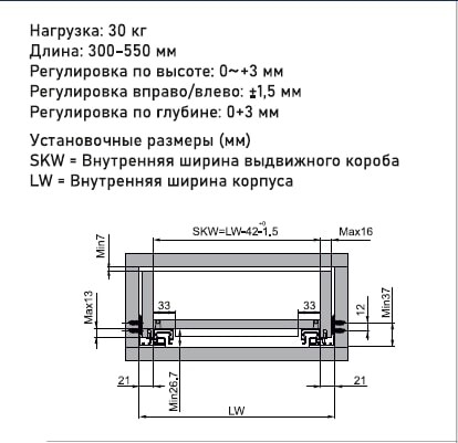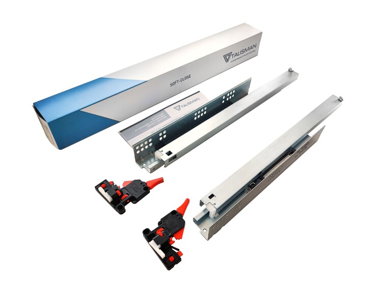 Направляющие TALISMAN SOFT-CLOSE имеют четкое, плавное, бесшумное срабатывание доводчика на закрывание. Полное выдвижение, систему синхронизации, широкие регулировки по высоте, глубине, вправо/влево, динамическую нагрузку 30кг. Ширина ящика от 300 до 1200мм, длина направляющих от 300 до 550мм.